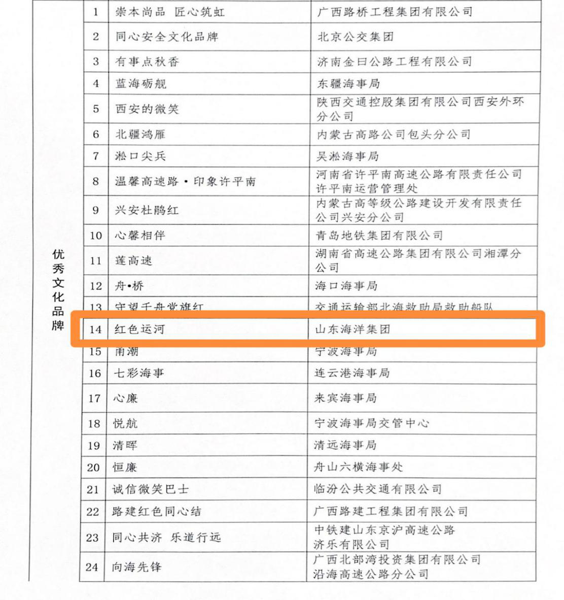 山東海洋集團“紅色運河”文化品牌榮獲第三屆全國交通運輸行業“優秀文化品牌”